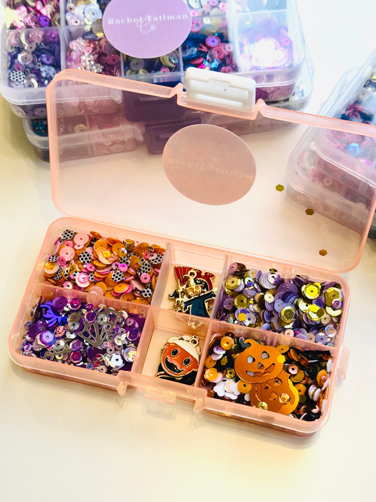 In this box, you’ll find four different Halloween-esque sequin mixes (3 teaspoons each). You’ll also find 6 Halloween charms!
